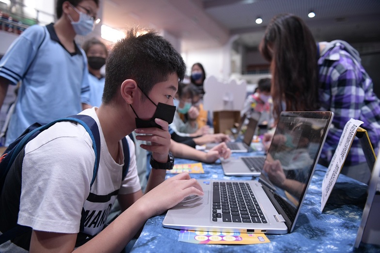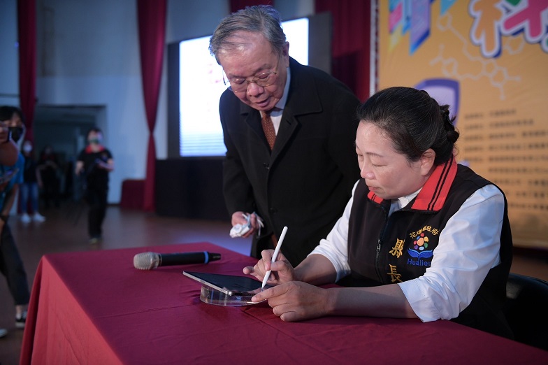 「花蓮縣2023科技與藝術教育成果聯展」今(2)日於中正體育館盛大登場,本次成果展主標以「Fun手玩科技」點題、展示學校跨域學習的多元面向;副標則以「洄瀾Show創意」呼應主標;本次館內共規劃六大體驗專區,超過100攤的主題攤位,呈現花漾多元的教育風貌,花蓮縣長徐榛蔚與國寶書法大師張炳煌老師更在活動現場運用「數位e筆書寫系統」書寫活動標語,透過特殊的動態筆跡,展現以傳統入手並超越傳統的創新書寫工具。