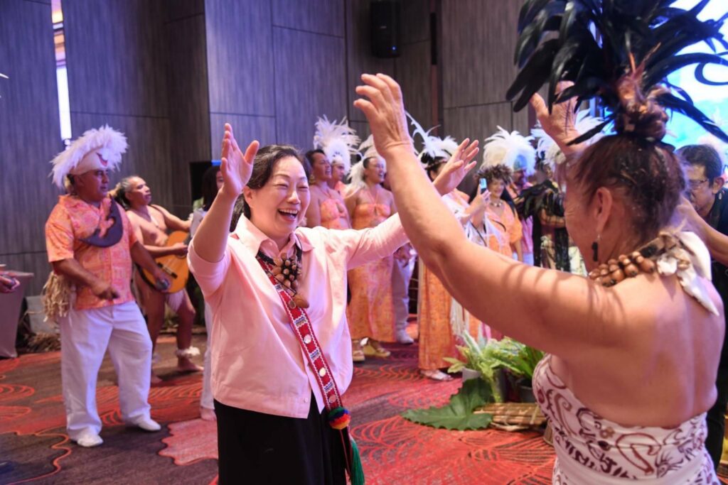 貴賓接待交流晚宴由花蓮縣政府培育的阿勒飛斯文化藝術團擔綱主軸,首先以南勢阿美的祈福儀式做為開端,為復活節島代表團進行誠摯的祈福;隨即阿勒飛斯文化藝術團帶來「Kalingko 花蓮六大族群禮讚」,用舞蹈及歌聲向來自復活節島的貴賓介紹花蓮六大原住民族族群的樂舞文化,讓現場復活節島的賓客讚嘆不已。除此之外,為了表達對於復活節島代表團的崇高敬意,徐榛蔚縣長準備了胡銀祿老師親手雕刻的「達邦(Tapang)」木頭雕像,以頭目、傳統領袖的意象致敬復活節島貴賓及傳統文化;同時,花蓮縣政府亦為所有貴賓準備本縣原住民族文化最具代表性之一的情人袋,並親自為每位披戴,象徵著彼此間的情誼常存永駐。