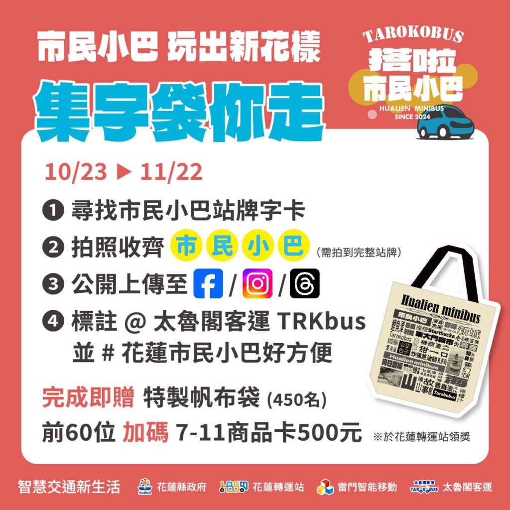 第一重:「分享抽好物」於10月16日至10月22日中午12:00止熱烈展開,民眾只需前往太魯閣客運 Facebook 粉絲團,分享新系統介紹貼文並留言,即有機會抽中精美好禮;第二重:「加 LINE 拿獎品」則於發表會當天舉行,凡加入「太魯閣客運」官方 LINE 好友,並完成一次市民小巴動態查詢,即可現場兌換限量專屬贈品,數量有限,送完為止;第三重:「集字袋你走」活動自10月23日起至 11月22日止,民眾可透過指定互動遊戲尋找張貼於市民小巴站牌上的活動字卡『市、民、小、巴』,並拍照上傳至個人 Facebook、Instagram 或 Threads 帳號(需設為公開),同時標註『#太魯閣客運TAROKOBUS』與『#花蓮市民小巴好方便』,即可兌換限量紀念品。所有贈品及紀念品數量有限,送完為止。