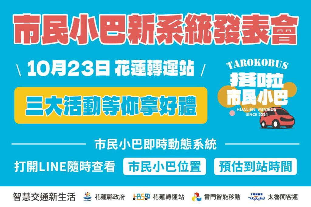 為慶祝「搭啦 市民小巴」品牌與新系統正式上線,花蓮縣政府與太魯閣客運將於10月23日(星期四) 在花蓮轉運站舉辦發表會,邀請市民與旅客共同見證花蓮公共運輸服務升級的新篇章。為回饋長期支持的乘客,特別推出「專屬限定好禮三重送」活動。