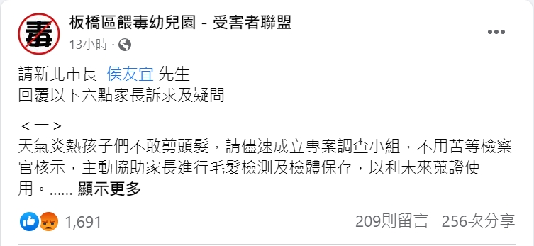 新北私立幼兒園發生疑餵藥案,臉書(Facebook)社群「板橋區餵毒幼兒園-受害者聯盟」對新北市長侯友宜提6點家長訴求及疑問,首先就要求市府儘速成立專案調查小組,不用苦等檢察官核示,主動協助家長進行毛髮檢測及檢體保存,以利未來蒐證使用。。