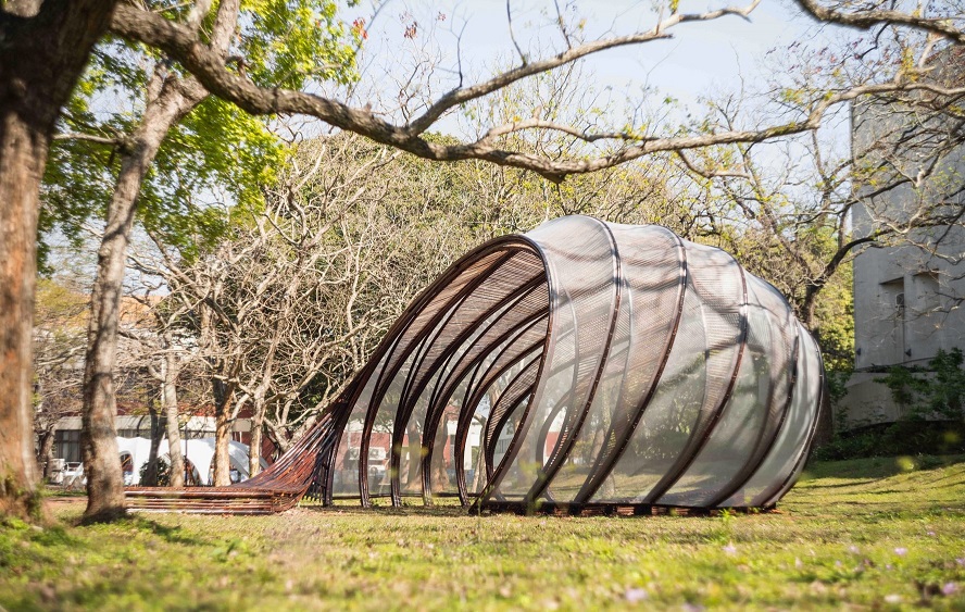 率先揭開序幕的嘉義展區「林鐵構築竹」共展出13件大型竹構築作品,分布於嘉義製材所、車庫園區、竹崎車站、梨園寮車站、水社寮車站以及十字路車站。搭乘阿里山林業鐵路主題列車,在各車站與竹構作品間穿梭連接,讓民眾有機會欣賞這些竹構築作品,感受竹材在建築結構應用的多樣呈現,細細品味竹構作品與環境融合的美感。