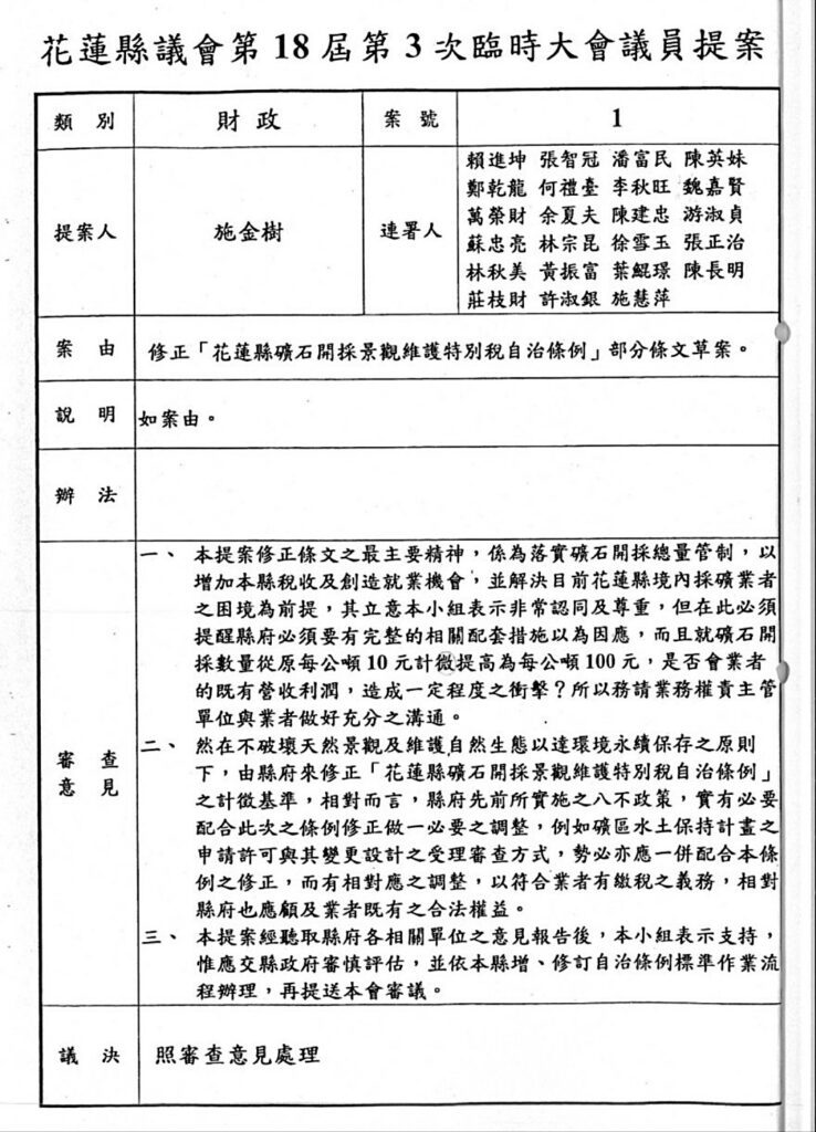 由花蓮縣議會第18屆第3次臨時大會,由議員率先連署提案提高礦石稅至百元/噸!