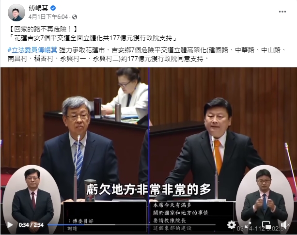 立法委員傅崐萁日前在臉書粉絲專頁貼出日前於立法院質詢的影片,指出,『不管是哪一黨的總統候選人,都說把花東人安全回家的路建構好,是總統的事情。「花東雙軌電氣化」千呼萬喚始出來,於3月24日正式動工,花蓮市到吉安鄉短短6公里,包括:建國路、中華路、中山路、南昌村、稻香村、永興村一、永興村二平交道,有7個判定為危險的平交道,是不是要一併來高架化改善?王國材部長答復時指出,他到現場看過確實非常危險,考量花東雙軌化效益,將修正計畫納入7個危險平交道改善,送行政院核定。陳揆也表達同意支持!』。貼文留言區中許多民眾皆向表達支持與感謝。