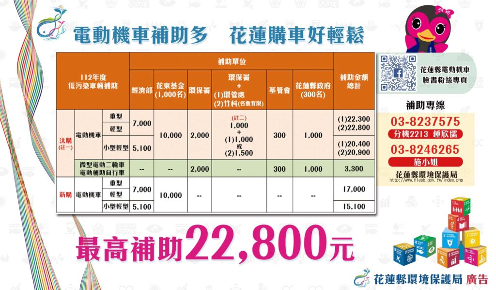 112年度於1月1日開始受理花東基金換購電動機車補助申請,每輛補助1萬元,另環保署針對「淘汰」民國96年6月以前出廠的燃油機車,即可獲得2,000元補助及300元回收獎勵;若民眾有新購機車需求,則鼓勵「換新」購買電動機車,每輛電動機車在其生命週期中可以減少2.3公噸CO2e,依據「淘汰老舊機車換購電動機車溫室氣體減量獎勵辦法」,民眾可選擇由環保署(每輛1,000元)或竹科管理局(每輛1,500元)收購汰舊換購電動機車減量效益,竹科管理局分兩年收購10萬輛,名額用完為止,除了環保署及花東基金加碼,另有經濟部工業局及花蓮縣環境保護局補助,最高共可補助2萬2,800元。