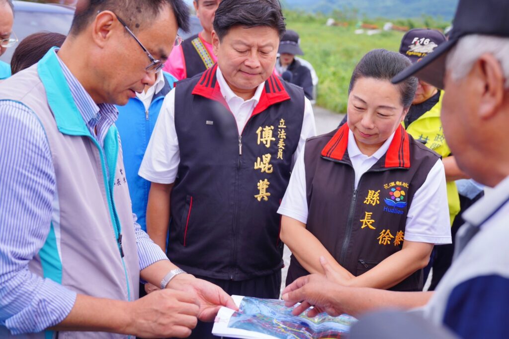 立法委員傅崐萁今(5)日協同農業部部長陳吉仲、花蓮縣長徐榛蔚、立委鄭天財、富里鄉長江東成、壽豐鄉長曾淑懿、花蓮農改場、農村水保署花蓮分署、農田水利署、農糧署東區分署、花蓮縣政府農業處、富里鄉農會、玉溪地區農會與當地農民,共同至花蓮縣富里鄉、玉里鎮大禹、壽豐鄉等地,勘查及聽取簡報。會中立委傅崐萁要求中央政府須跨部通盤整治野溪邊坡河川上中下游,立即編列預算做好治山防洪才能有效避免豪雨造成土石崩落、農路、水路及作物受損,對於農損救助部分從寬認定並延長加強型農業保險一個月至九月底以協助農民能獲得理賠。花蓮縣長徐榛蔚也提出專案趁高寮大橋重建前疏濬河川及即刻修復大禹地區農水路,以徹底解決秀姑巒溪倒灌淹沒良田問題。農業部長陳吉仲表示,當場指示農業部各單位全力支援緊急搶修、搶通及經費,災後復建則彙整提報公共工程委員會,金針花全區已公告天然災害救助,今日將陸續公告全區食用玉米、芥菜、落花生、大豆為天然災害救助地區。其他遞延性作為也將滾動式公告,請地方公所彙整提報。至於富里農會及稻草藝術祭損失860萬將全力協助,二期水稻部分不含秧苗將由農業保險補償。