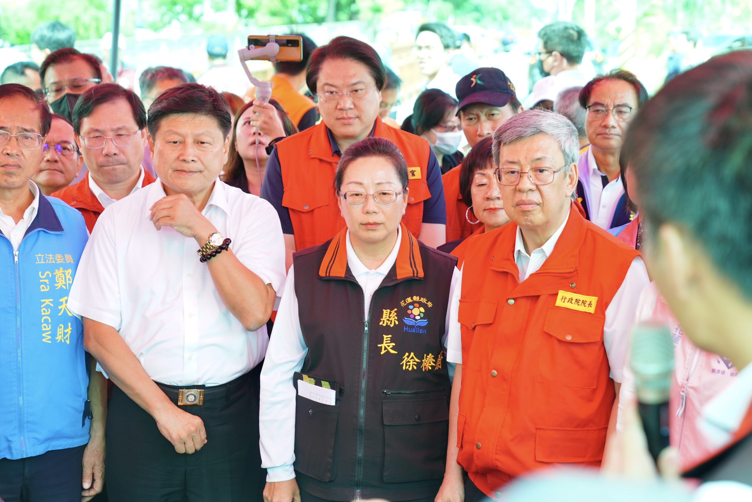 行政院長陳建仁首先赴花蓮縣吉安鄉光華排水水利設施視察治理績效,並於現場聽取災損簡報,花蓮縣府建設處表示,花蓮縣明里大橋、蚊子洞橋、西寶大橋受損嚴重及花74縣道下邊坡路基掏空,重建經費共需3億5千5百40萬元,另外縣府農業處表示赤柯山、六十石山道路縣府全力搶修中,壽豐鄉豐山村山邊路住戶遭土石掩埋情形。
