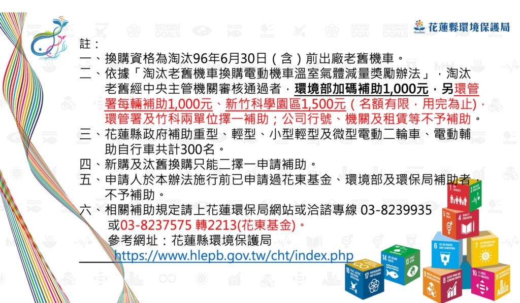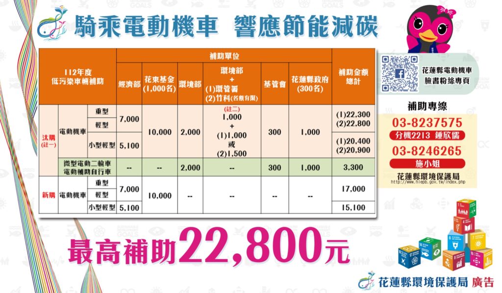 近年來騎乘電動機車降低交通工具廢氣排放已逐漸成為潮流,經由媒體託播、網路社群分享及辦理多場試乘電動機車宣導活動等多元方式推廣補助訊息,提升民眾購買電動機車之意願,為了方便民眾及遊客騎乘電動機車,另,針對96年6月以前出廠的汰舊燃油機車,環境部提供2,000元補助及300元回收獎勵;若有新購機車需求,則鼓勵換新購買電動機車,將以「減碳效益」方式補助,每輛可取得2.3噸的減碳憑證(等同價值2,500元)。此外,環境部及花東基金加碼,再加上經濟部工業局、花蓮縣環保局補助,最高可獲2萬2,800元補助。