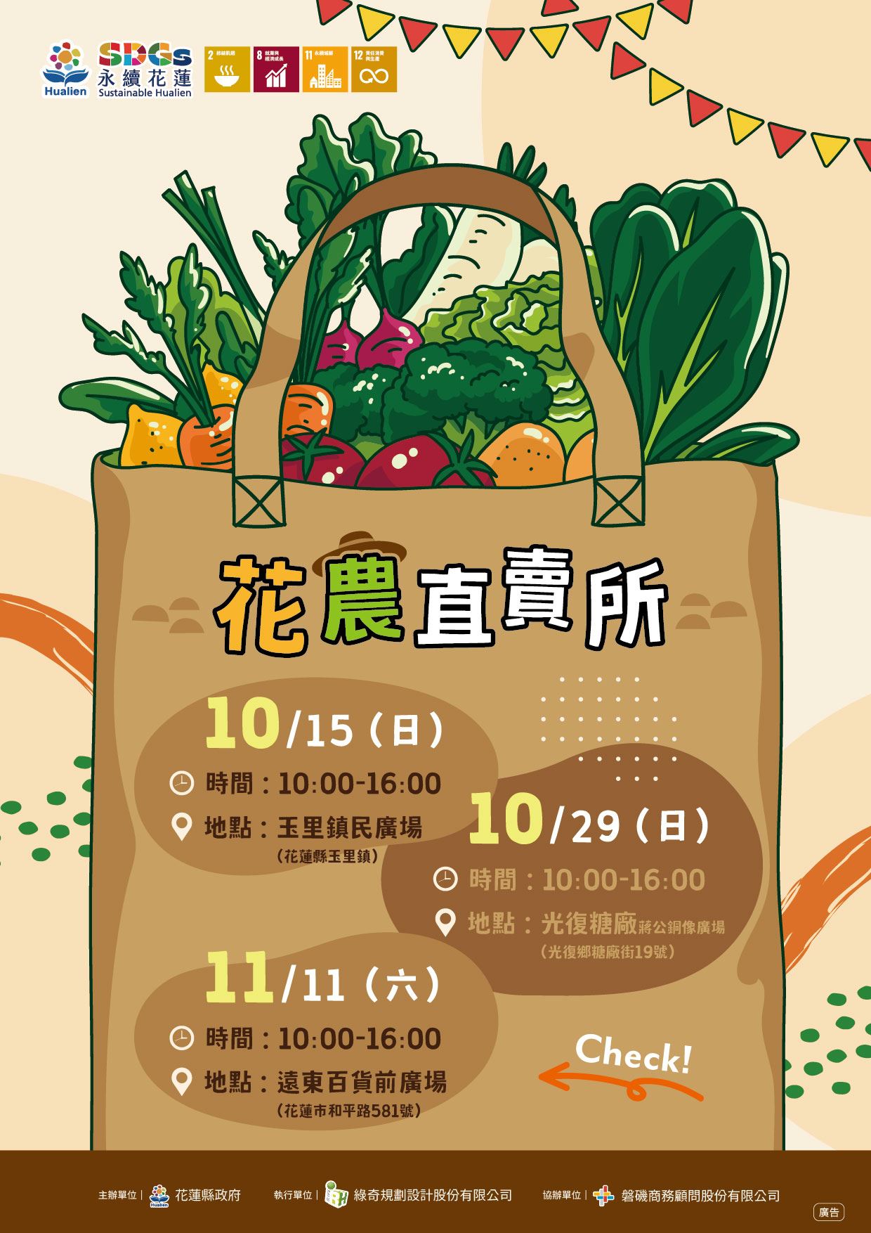 花蓮好山好水、優質農業形象深入人心,花蓮縣政府重視農業與農村的發展,攜手地方民間團體,共同創造更好的農業生產環境,為讓民眾一同認識最新鮮、最在地的優質農產,縣府特別舉辦「花農直賣所」北中南巡迴市集,首場市集10月15日將在玉里鎮民廣場登場。