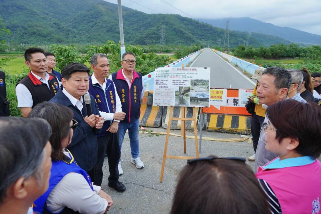 富里鄉長江東成表示,即將進入農民採收季節,崙天、明里都是農民重要聯外橋樑,希望傅委員、工程會、縣府建設處在農民收割完成前將崙天便道建成,在明里大橋重建工程完工前,先建明里便道。
