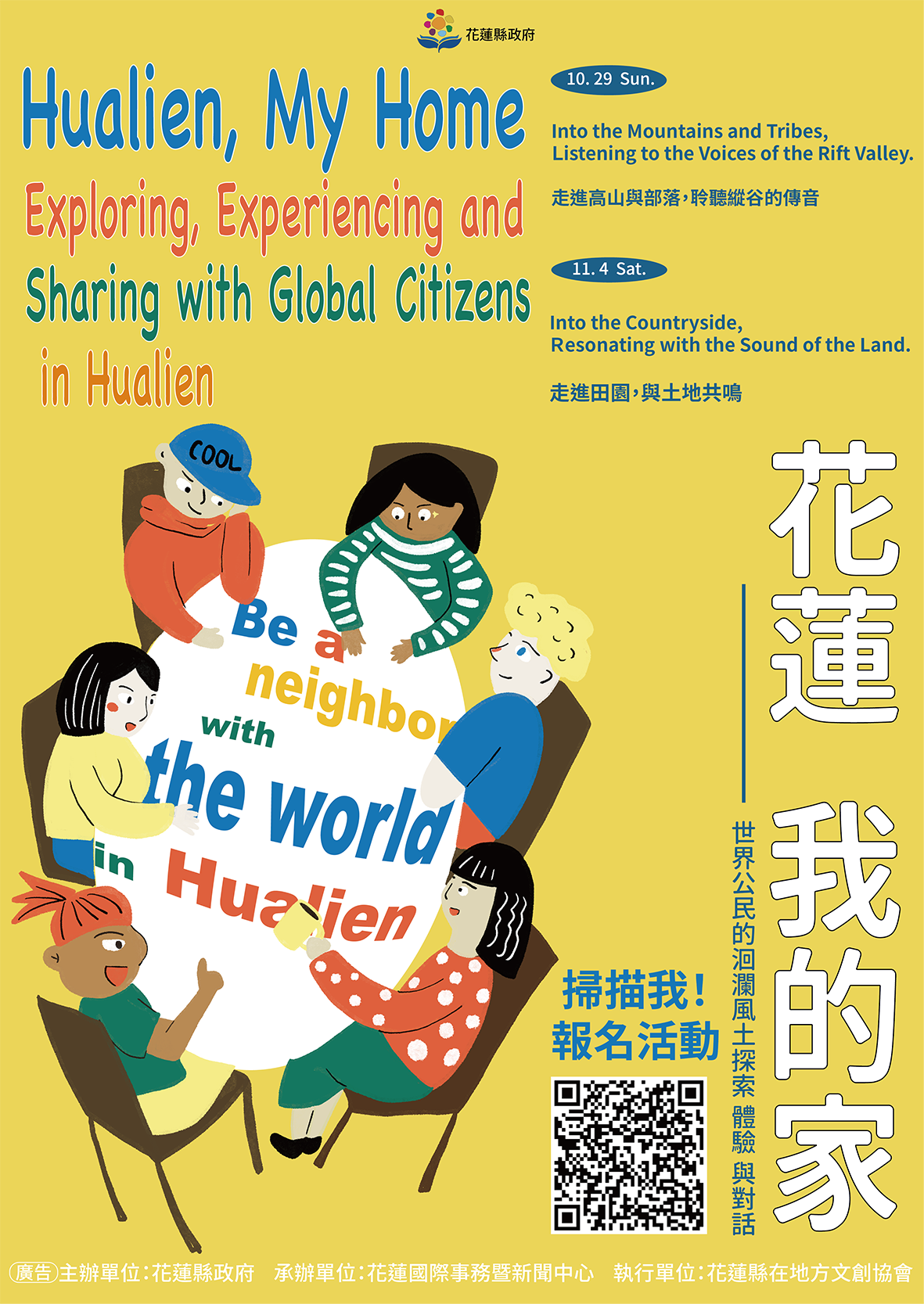 花蓮縣政府為促進居住在花蓮的外國人士更深度認識花蓮,將於10月29日(週日)與11月4日(週六)分別於卓溪、壽豐兩地,舉辦「花蓮,我的家:世界公民的洄瀾風土探索、體驗與對話」多元交流活動,邀請旅居花蓮的外籍友人們走入縱谷,一同探索花蓮的風土人情;同時也期許不同國籍之間的對話,開展異文化的交流與認識,並從中尋思、提升未來花蓮宜居與移居的方向。
