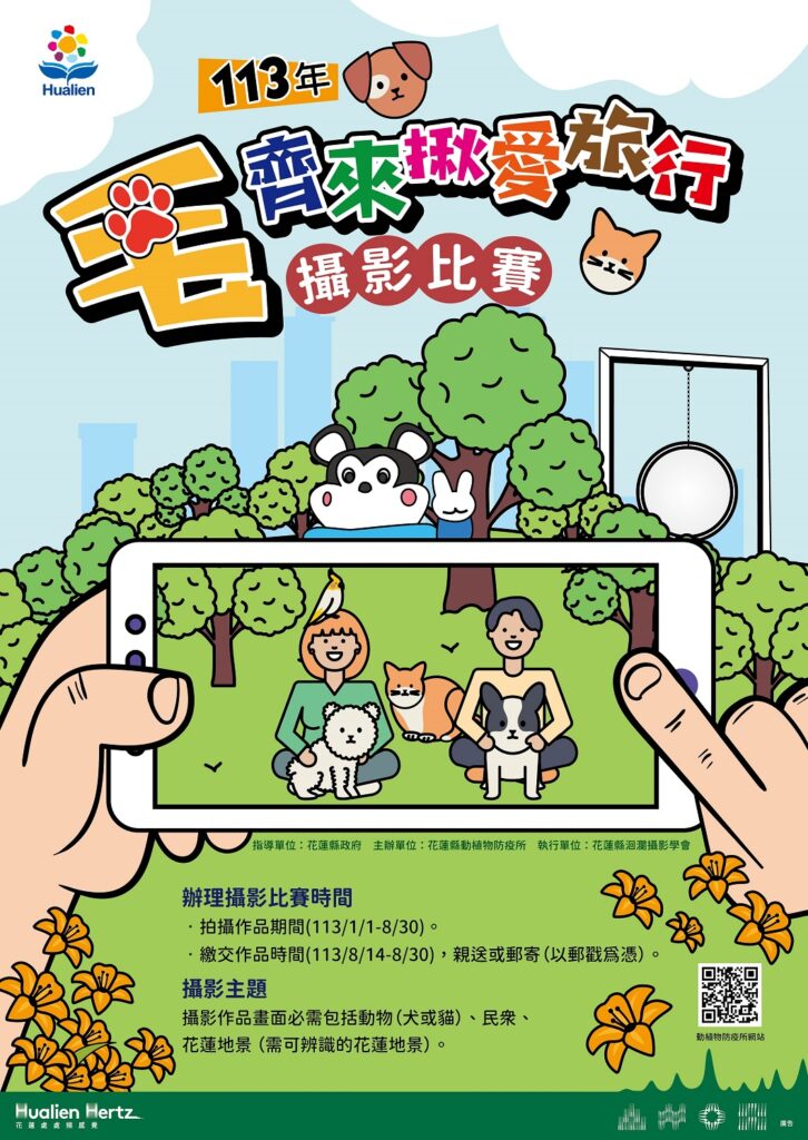 花蓮縣政府推動首次「『毛』齊來揪愛旅行攝影比賽」,歡迎全國民眾一起「寵」愛家中的牠,來趟花蓮旅遊之際,攝影留下回憶的同時也可參加比賽,參賽者只要在113年8月30日前投件,就有機會能獲得大獎,此次總獎金十萬元。