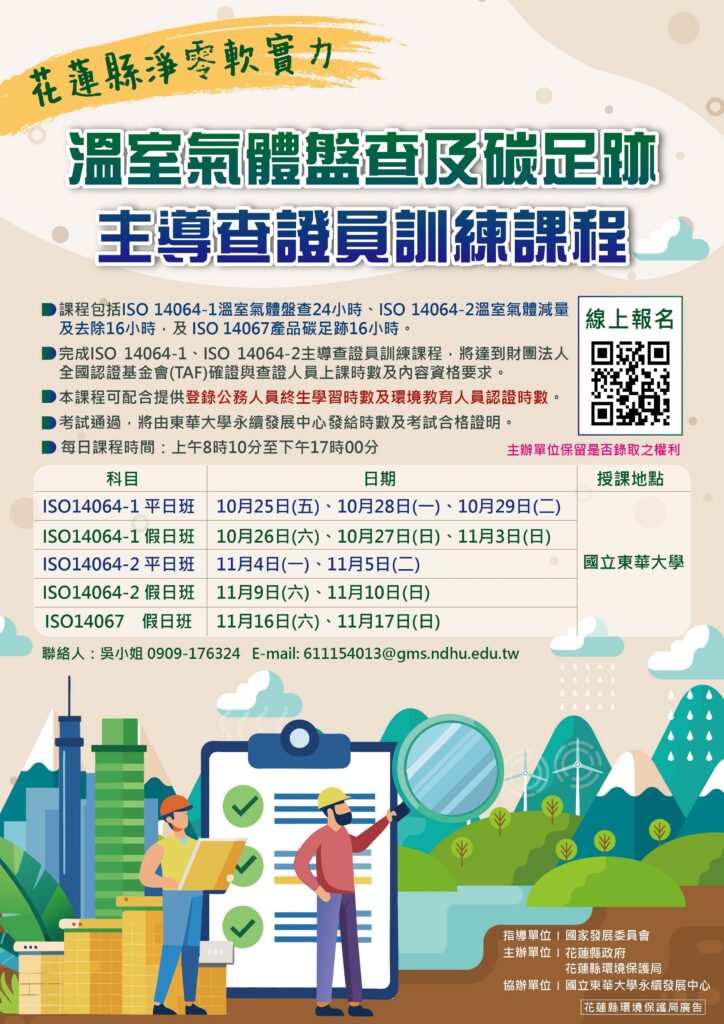 為達成2050淨零目標,培育花蓮縣在地碳盤查、碳足跡及碳中和人才,花蓮縣政府結合國立東華大學永續發展中心辦理「溫室氣體盤查及碳足跡主導查證員訓練課程」,因應淨零轉型所需的龐大綠領人才,及受影響企業對象淨零基礎建構,協助東部強化淨零人才培訓,培訓課程現正開放報名參與,歡迎您一起加入淨零碳排的行列!