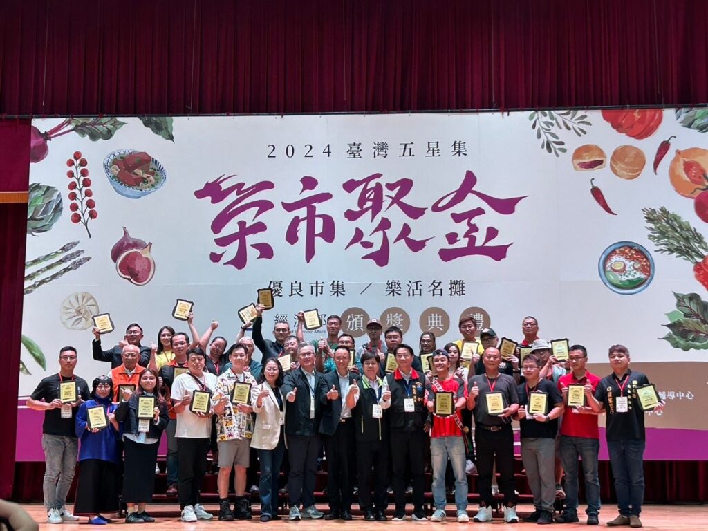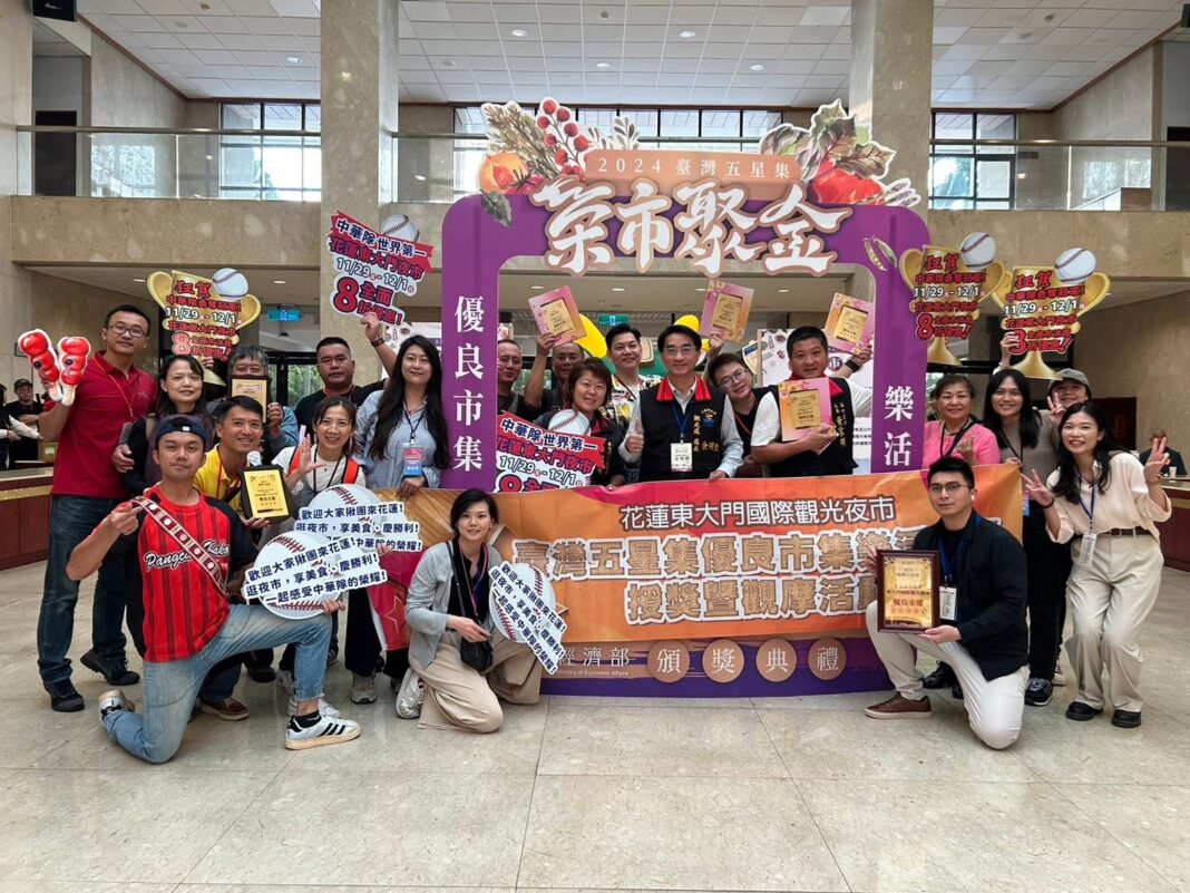 經濟部今(25)日於南投中興新村舉辦今(113)年度優良市集樂活名攤頒獎典禮,花蓮縣政府觀光處余明勲處長代表縣長徐榛蔚出席,帶領東大門夜市四區管委會福町夜市主委曾黃家明、原住民一條街主委楊秋農、自強夜市主委呂佩芹、各省一條街主委沈英基及獲獎攤商們前往南投領獎,拿下五星市集與樂活名攤721顆星榮譽!