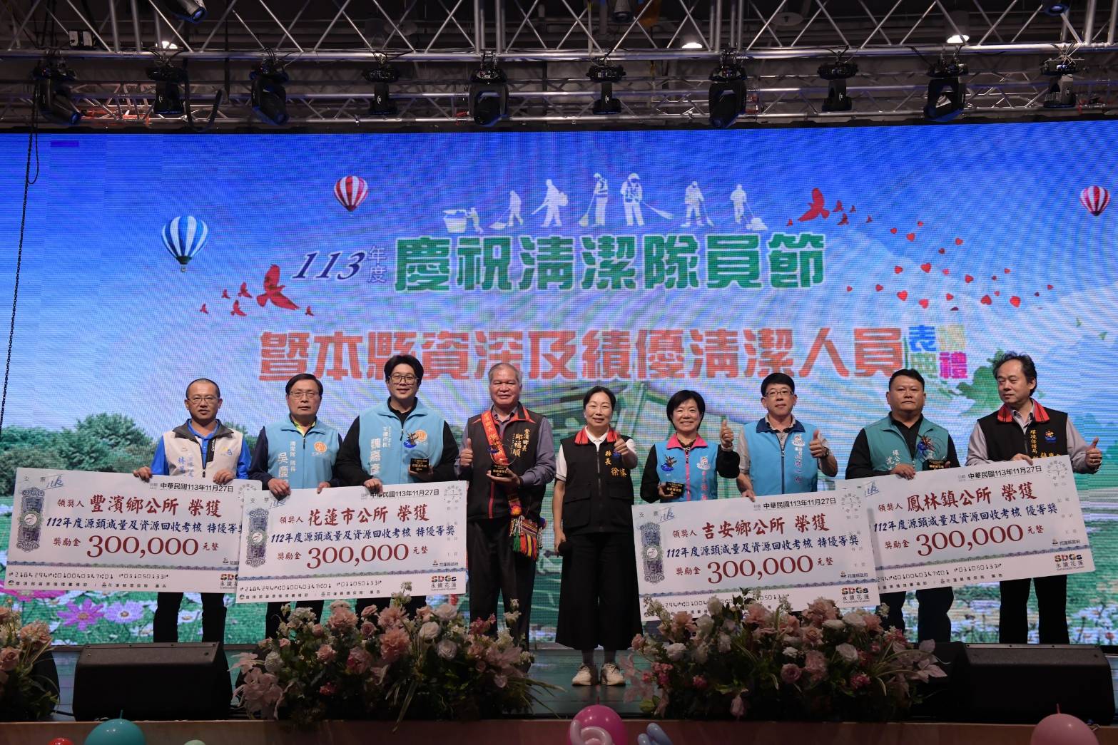 為表達對本縣清潔隊員平日辛勞付出的肯定與支持,花蓮縣政府今(27)日於新天堂樂園舉辦「慶祝清潔隊員節暨花蓮縣資深及績優清潔人員表揚典禮」,徐縣長榛蔚親自頒發推動執行機關加強資源回收工作績效考核績優獎之公所(花蓮市、吉安鄉、鳳林鎮、豐濱鄉)獎金各30萬元,並表揚113年度績優清潔人員(共20名)與資深清潔人員(共54名)。由各鄉鎮市民意代表獻上本縣民眾對清潔隊員感謝影片,表達對全體清潔隊員平日工作付出的肯定,歡度一個專屬於這些勞苦功高清潔隊員的重要日子。